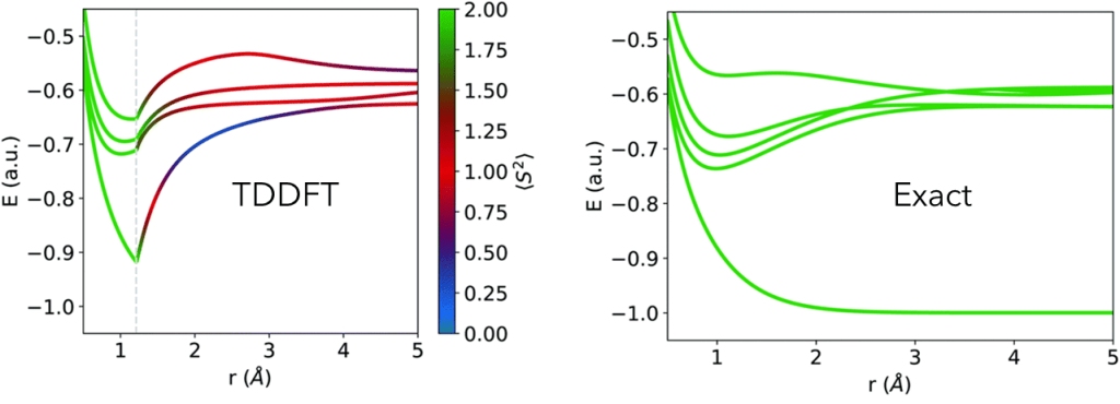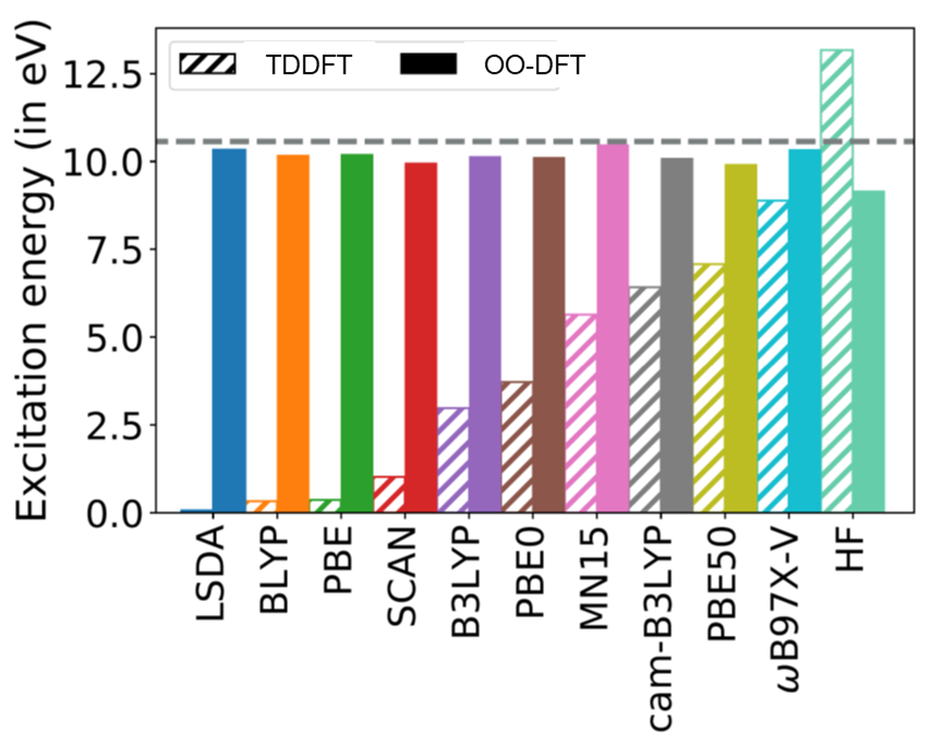 Electronic excited states are ubiquitous in all forms of light driven chemistry, but are quite challenging to simulate. Time-dependent density functional theory (TDDFT) is popular for modeling excitations, but is known to fail catastrophically in many regimes. Some chemically relevant examples are charge-transfer states, and excited state bond dissociations (as we recently showed). A large part of my research has focused on developing accurate (and computationally affordable) methods for simulating electronic excitations. The resulting publications can be found here.
